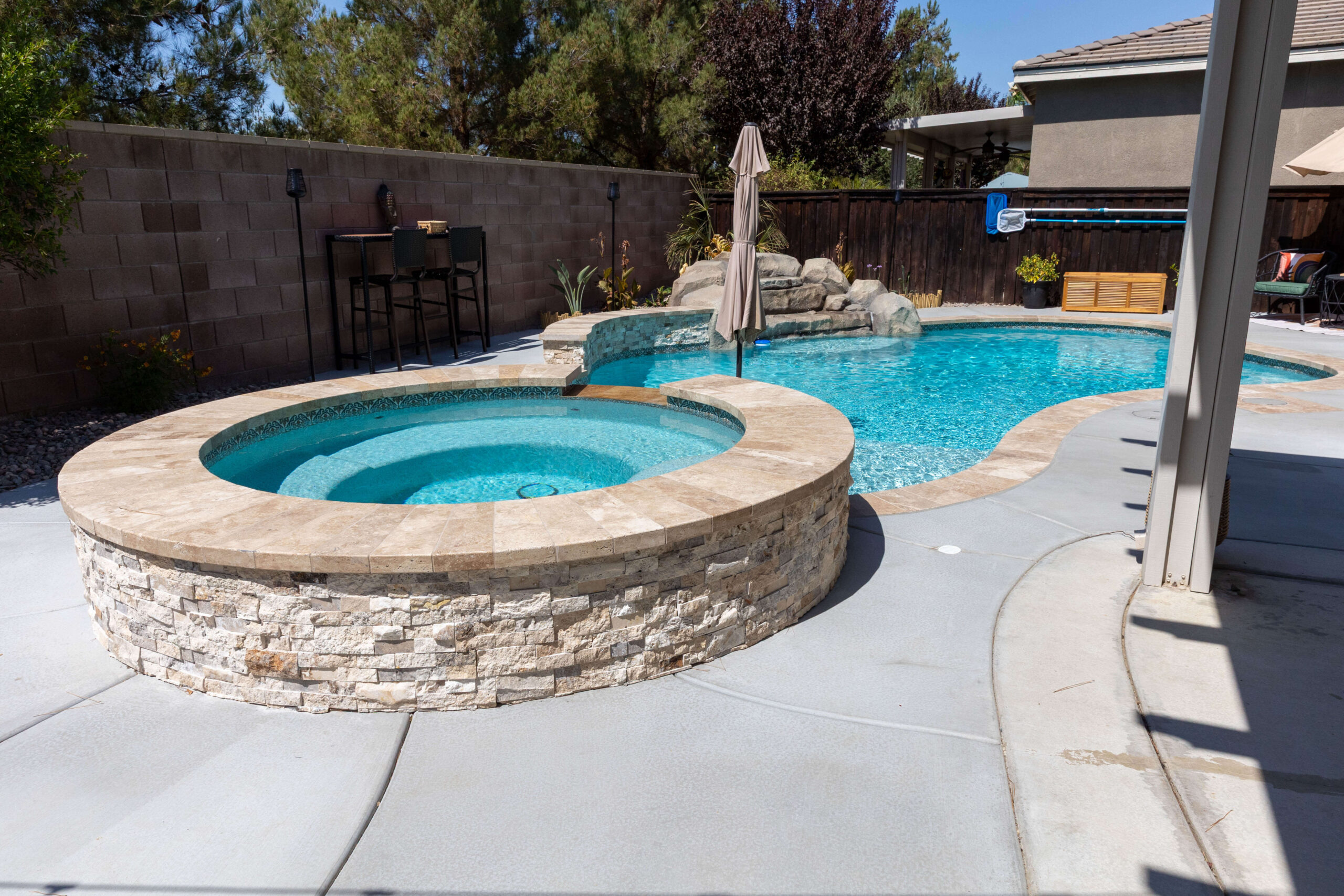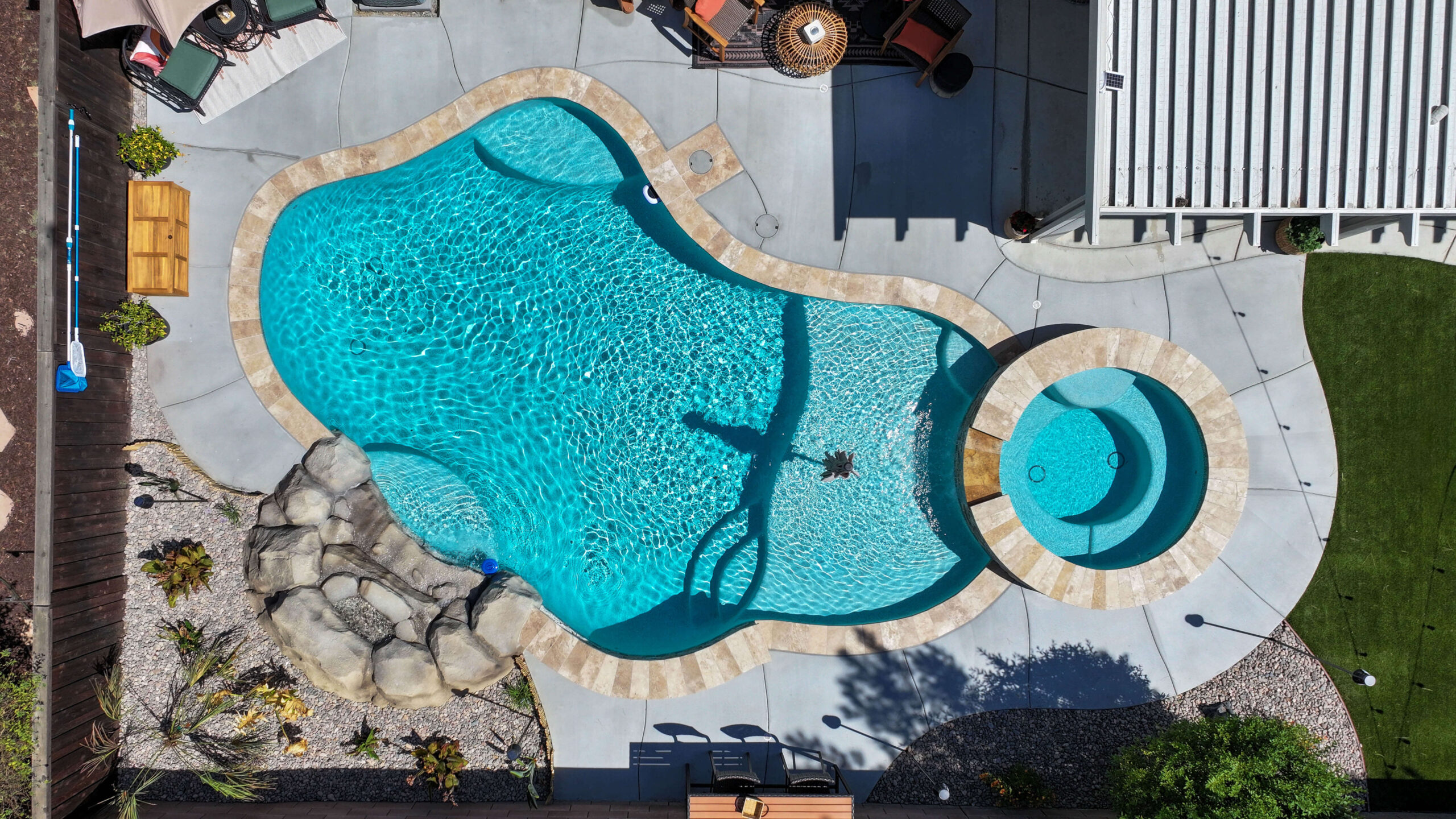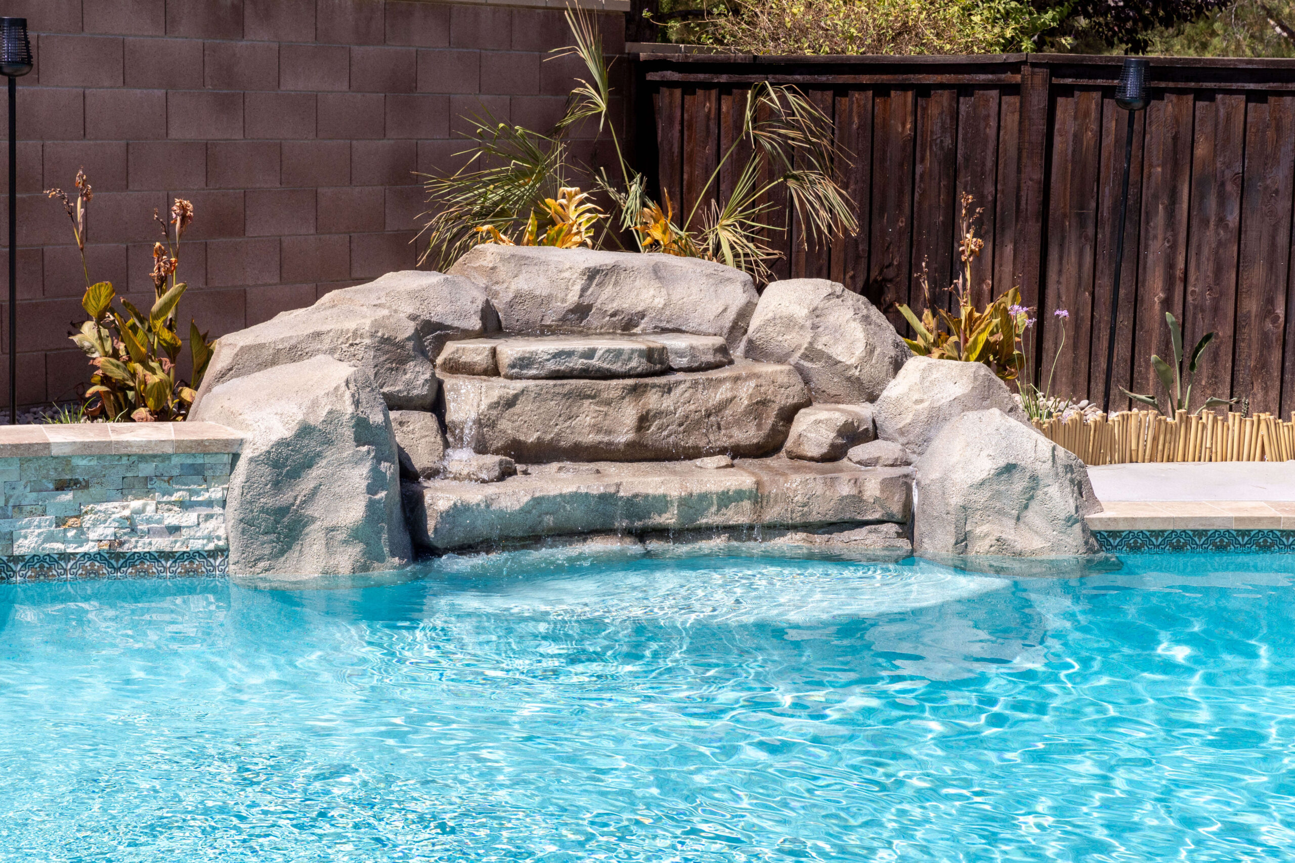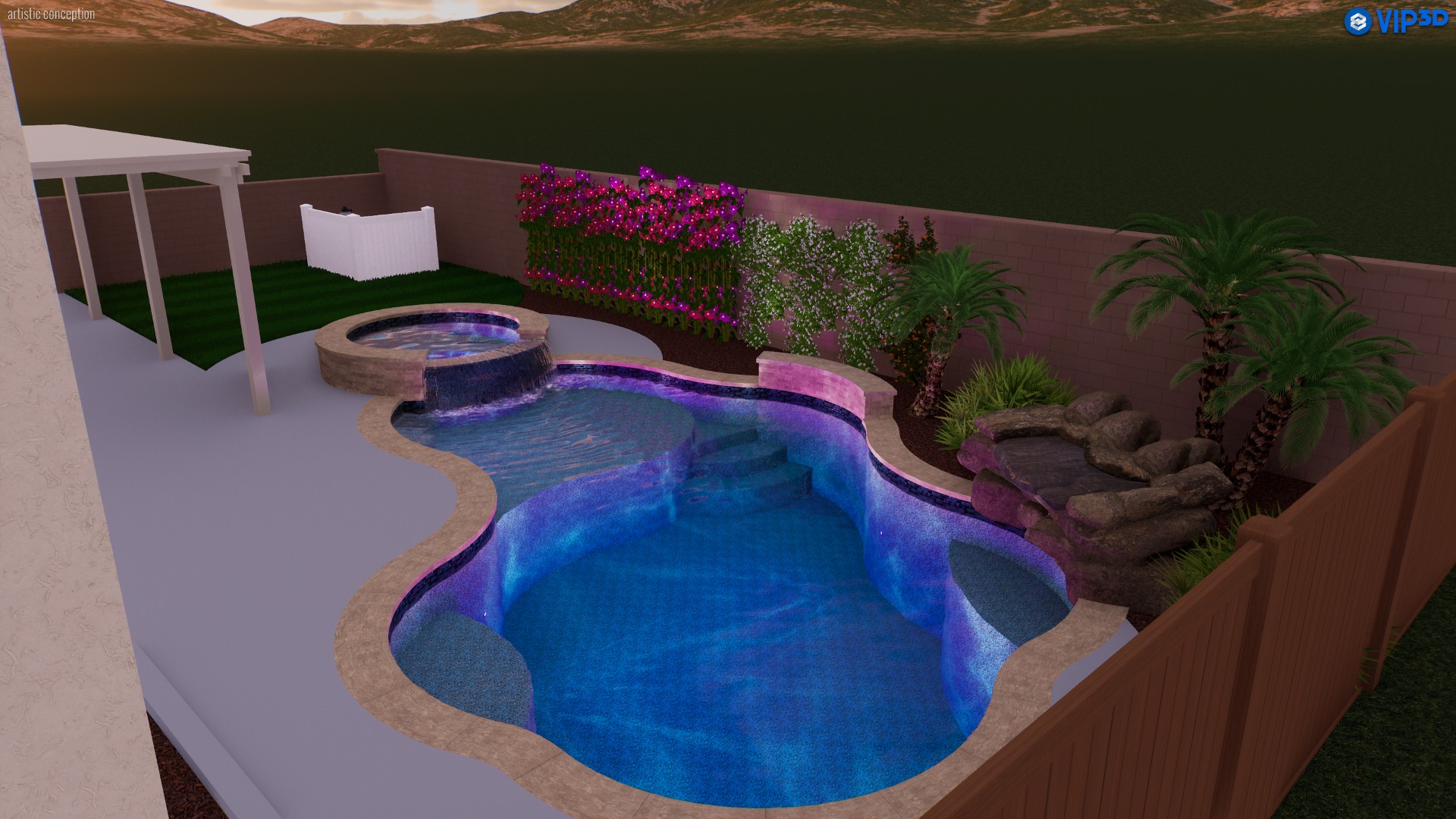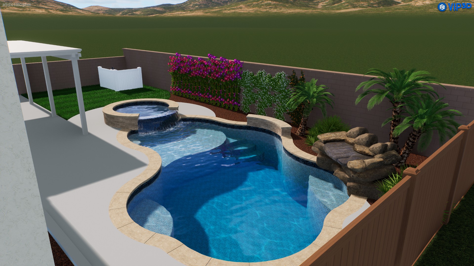 The goal here was simple. They wanted a Freeform pool that gave their yard a tropical feel. They also wanted some type of rock feature to make it look naturally in the elements. The good news was the patio cover already existed. One less thing on our list. being that the yard was small the equipment had to go off to one corner but we laid some nice turf around it and they will grow some hedges in front of it to hide it and make it look nice.